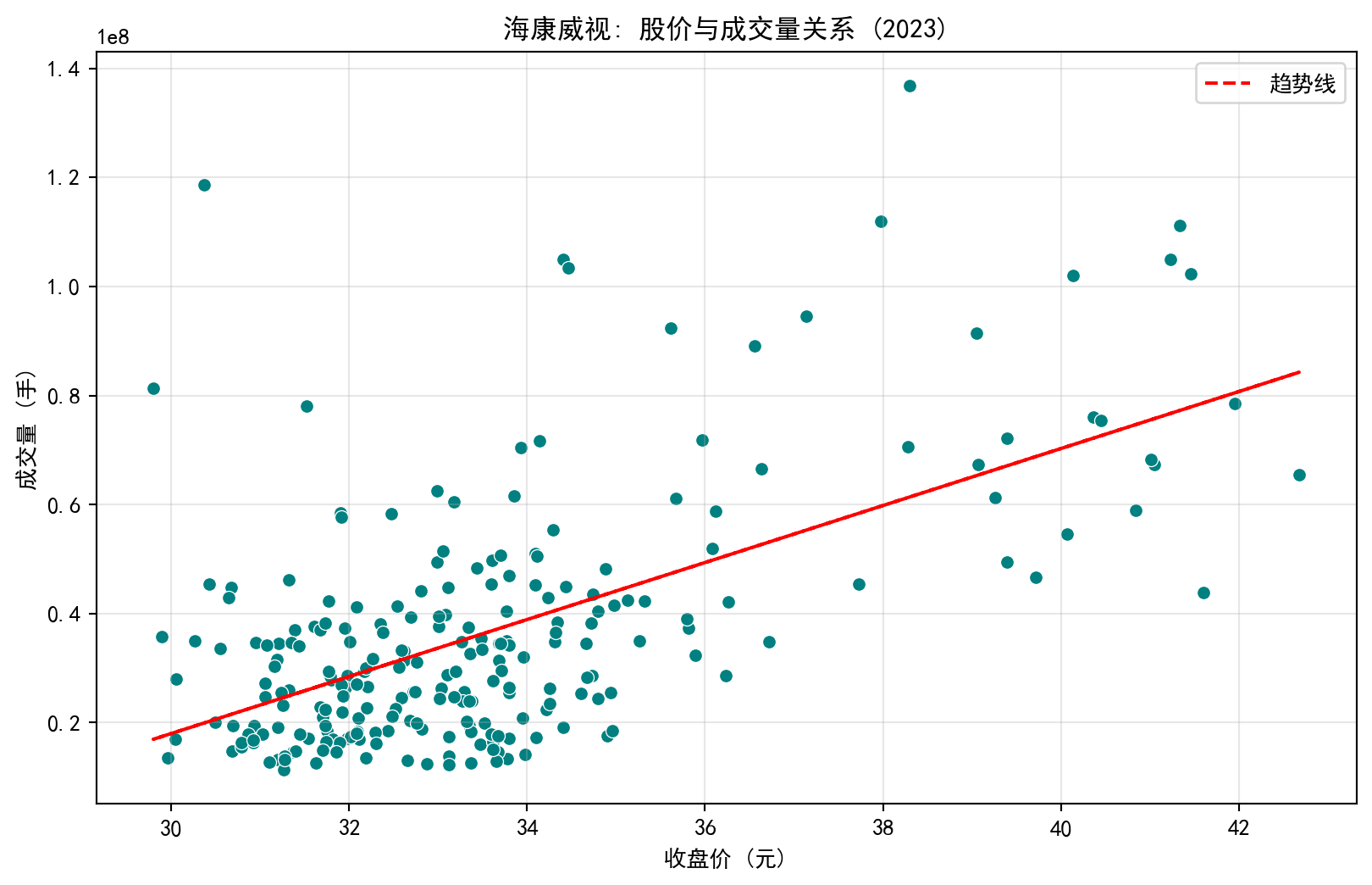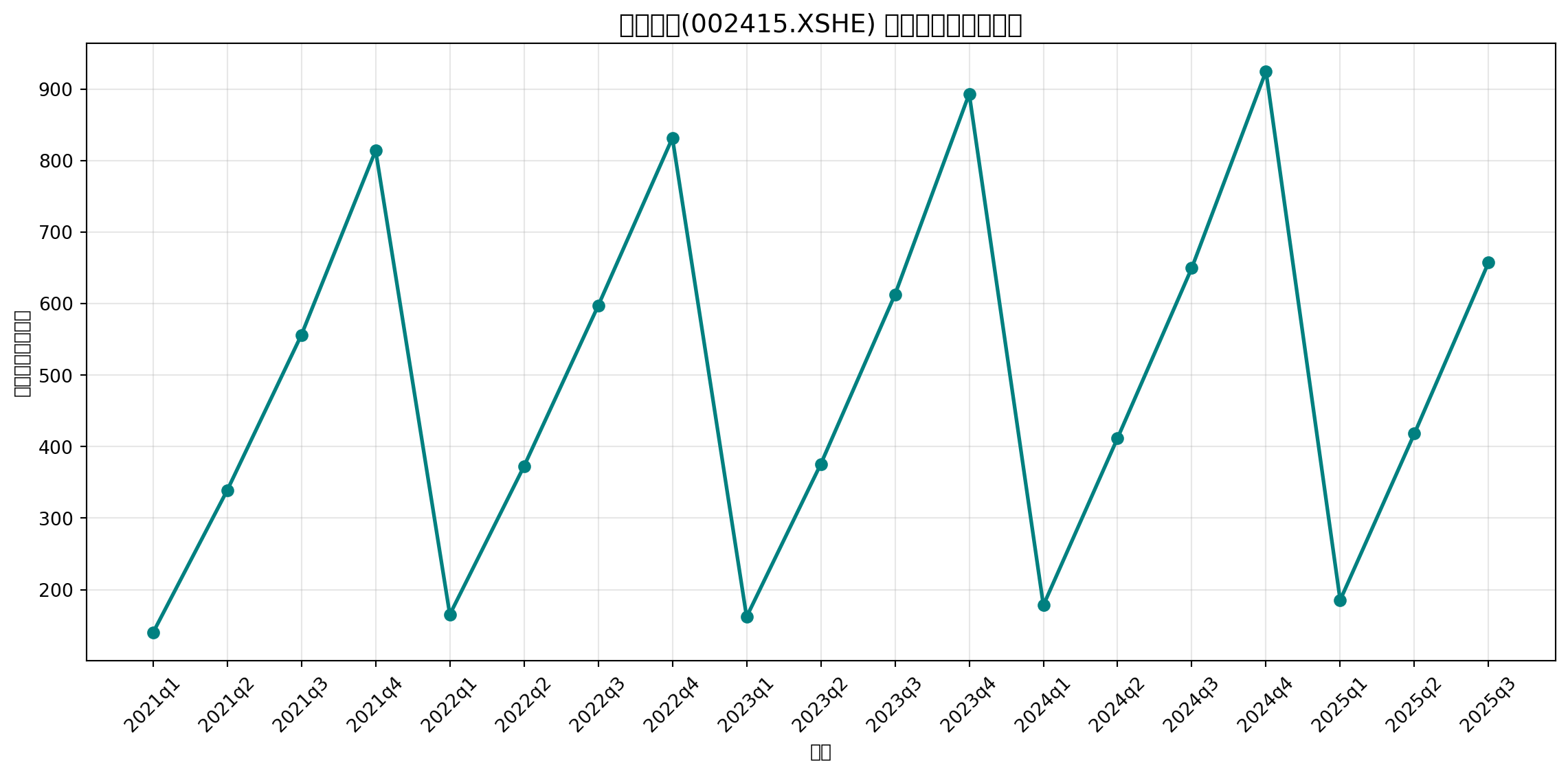 运行结果解读:从趋势图可以看出海康威视近三年季度营收呈现明显的季节性规律和波动趋势。每年第四季度(Q4)是全年营收的最高点,这反映了安防行业下半年(尤其是年底前)项目集中验收结算的行业惯例。2022年部分季度营收出现下滑,可能受到宏观经济和行业景气度的影响。2023年各季度营收整体有所回暖,但尚未恢复到2021年的峰值水平。从图形上看,海康威视的季度营收呈现典型的”低开-平稳-冲高”的年内节奏——第一季度通常是全年低点(受春节假期影响),中间两季度平稳增长,第四季度集中爆发。这种季节性模式对投资者在判断公司经营状况时非常重要:不能简单地将某个低季度的数据视为经营恶化信号,而需要进行同比(与去年同季度对比)而非仅环比分析。
