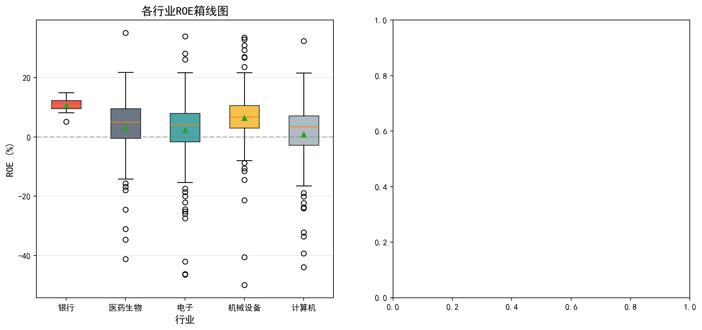 行业研究的基本问题是:不同行业的盈利能力是否存在显著差异?使用 financial_statement.h5 中的ROE数据,结合 stock_basic_data.h5 中的行业分类,对制造业、信息技术、金融、房地产、医药等多个行业的ROE进行单因素方差分析。如果F统计量显著,则说明行业归属对公司盈利能力有显著影响,进而使用事后多重比较(如Tukey HSD)识别具体哪些行业之间存在显著差异。