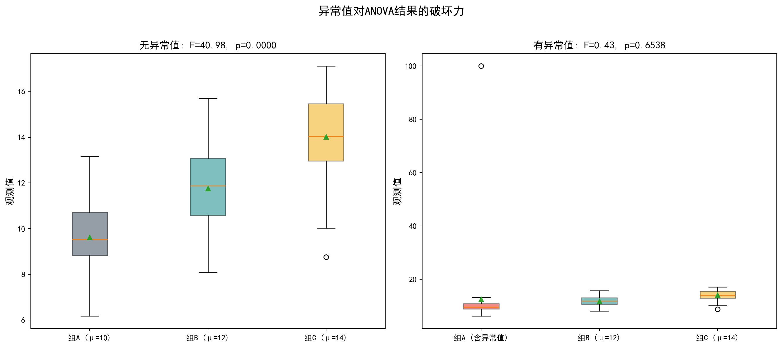 正态性:ANOVA 对轻微的非正态性是稳健的(Robust),但对严重偏态(如对数正态分布)非常敏感。