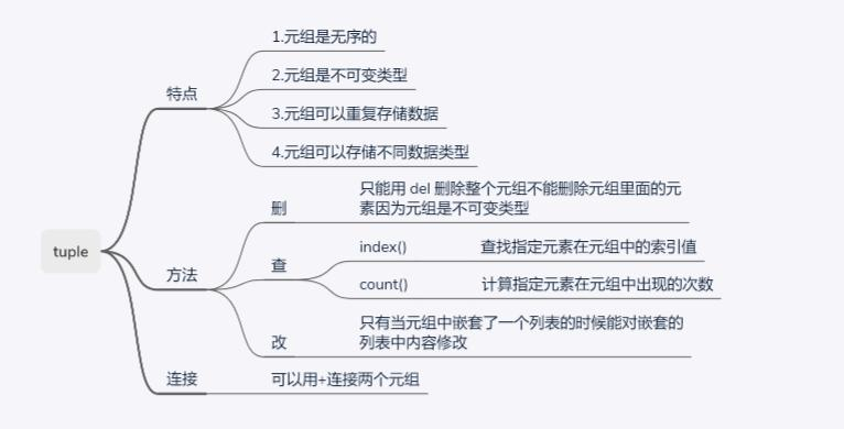 不能删除元组内的某个元素(因为元组不可变),但可以删除整个元组变量。index()