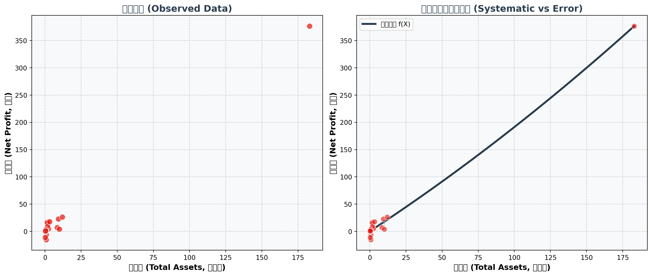 图 3.2 的运行结果展示了两幅并列的散点图。左侧面板直接呈现了30家长三角制造业上市公司的财务数据散点——每一个红色圆点代表一家公司,其横坐标为该公司的总资产规模(单位:百亿元),纵坐标为对应的年净利润(单位:亿元)。我们可以从中观察到一个直觉上合理的正相关趋势:总资产规模更大的公司,其净利润往往也更高,但这种关系并非完全确定性的——散点围绕趋势呈现出明显的随机波动。右侧面板在相同的散点之上叠加了一条平滑的深色二次多项式曲线,这条曲线就是我们对潜在真实关系 \(f(X)\) 的近似估计。连接每个散点到曲线的灰色虚线清晰地展示了误差项 \(\epsilon\) 的概念——它代表了现实观测值与理论预测值之间不可避免的偏差。有的公司实际利润高于曲线预测(正误差),有的低于预测(负误差),这正是因为净利润不仅取决于总资产,还受到管理效率、行业周期、竞争格局等诸多无法被单一变量完全捕捉的随机因素影响。