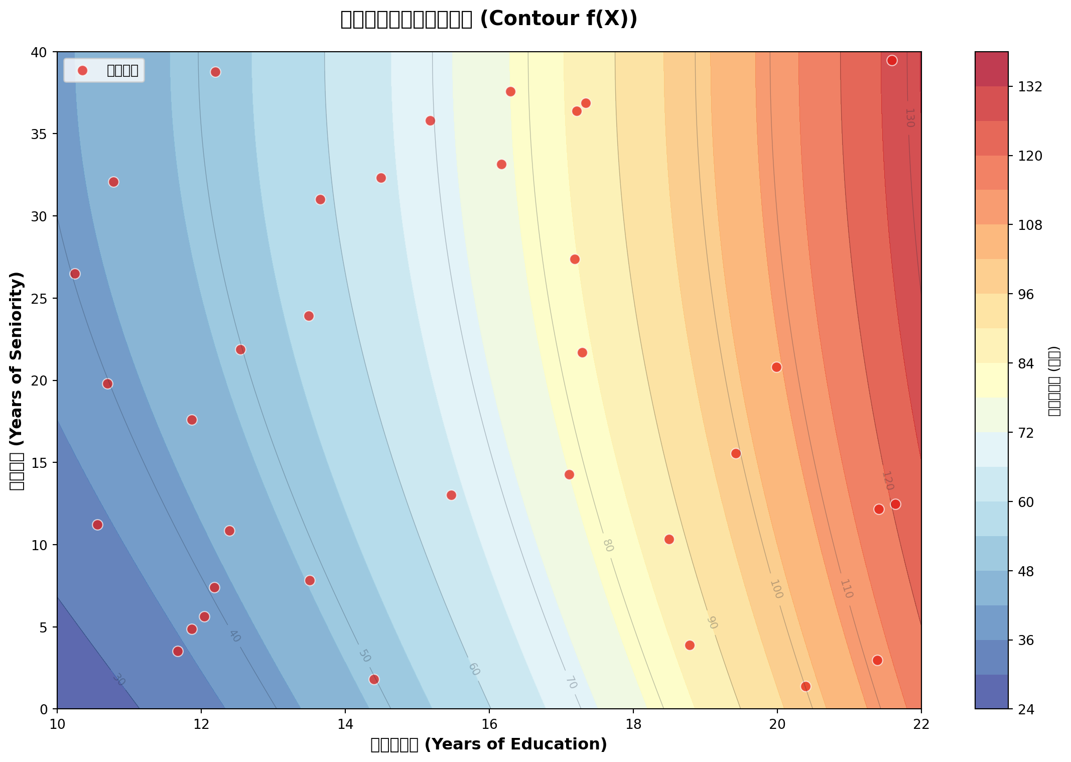 为了帮助大家直观理解多变量模型的作用机制,接下来的这段代码通过 Numpy 构建了一个二维的离散网格空间(代表受教育年限和工作年限组合的域)。我们定义了一个包含二次项的假设映射函数 \(f\),随后在其计算出的连续曲面上叠加了注入高斯随机噪音的少数模拟观测样本。最终,代码利用 matplotlib 生成了一张美感十足的等高线图(Contour Plot)。在这张图中,颜色的深浅生动地代表了预期收入的高低,而散布其中的红色圆点表示现实的观测样本。这种二维平面加第三维颜色的展示方式,是我们在特征分析中用来可视化多维 \(Y=f(X_1, X_2)\) 响应曲面形态的最主要工具之一。