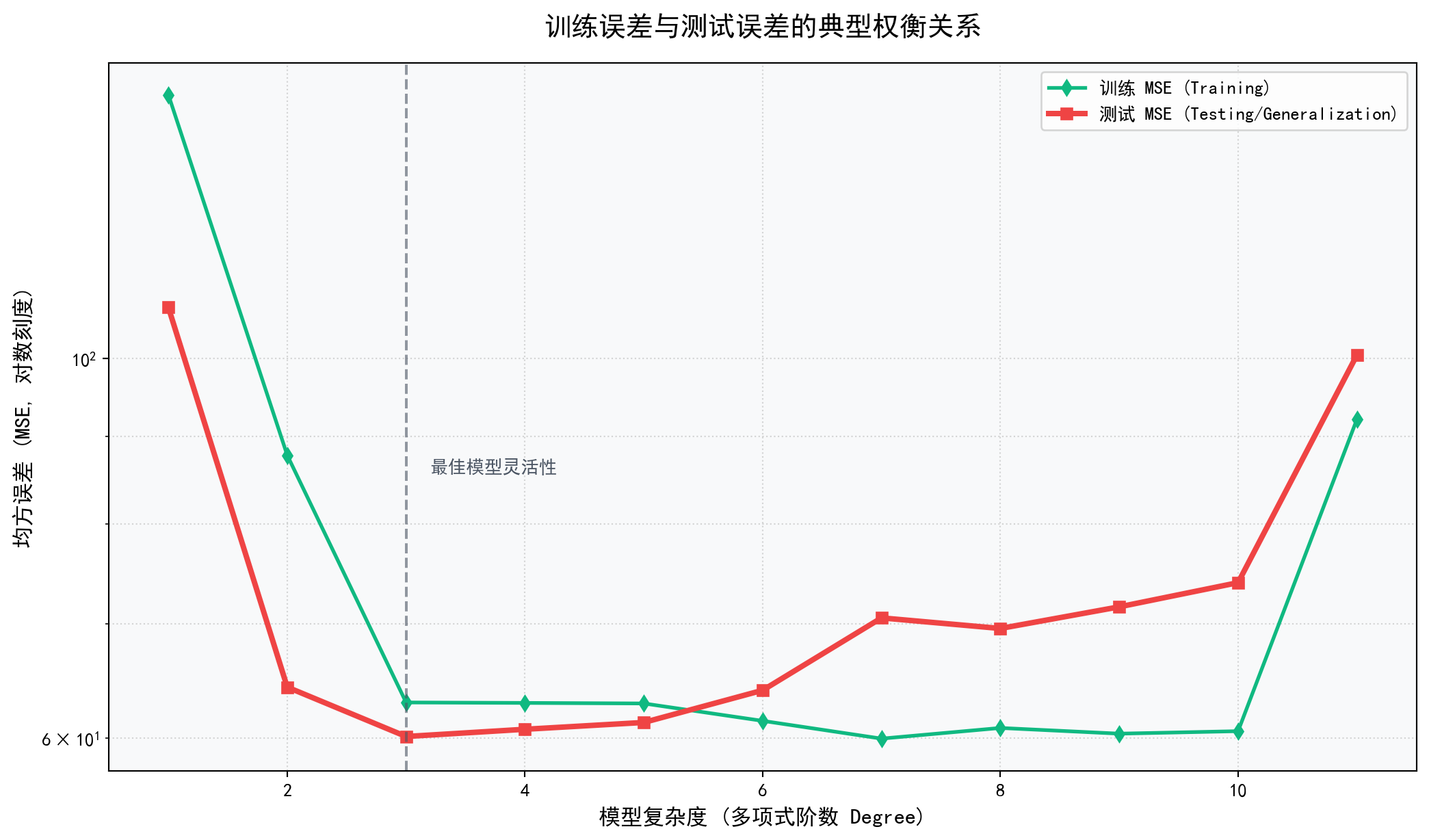偏差-方差权衡:更灵活的模型能够追踪训练数据中的每一处波动(低偏差),但这种“过度贴合”往往捕捉了仅属于该样本的随机噪声(高方差)。当应用于新样本时,这些噪声模式不复存在,导致预测失败。