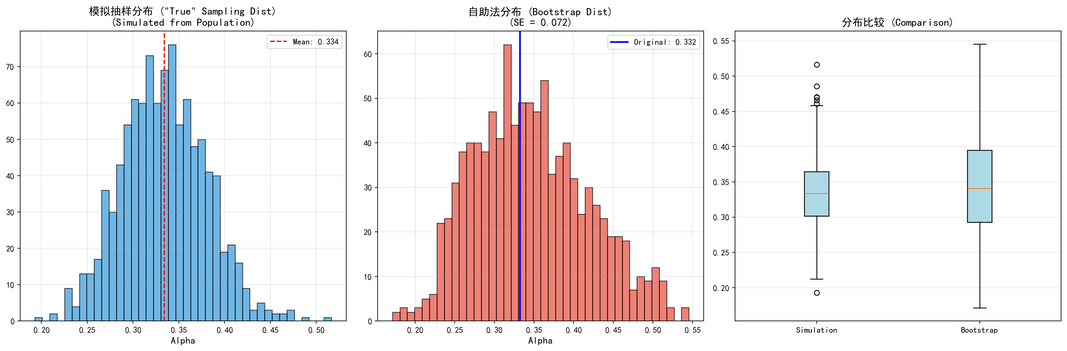 - bootstrap:重复有放回抽样得到 \(\bar r^*\) 的分布,取 2.5% 与 97.5% 分位数。