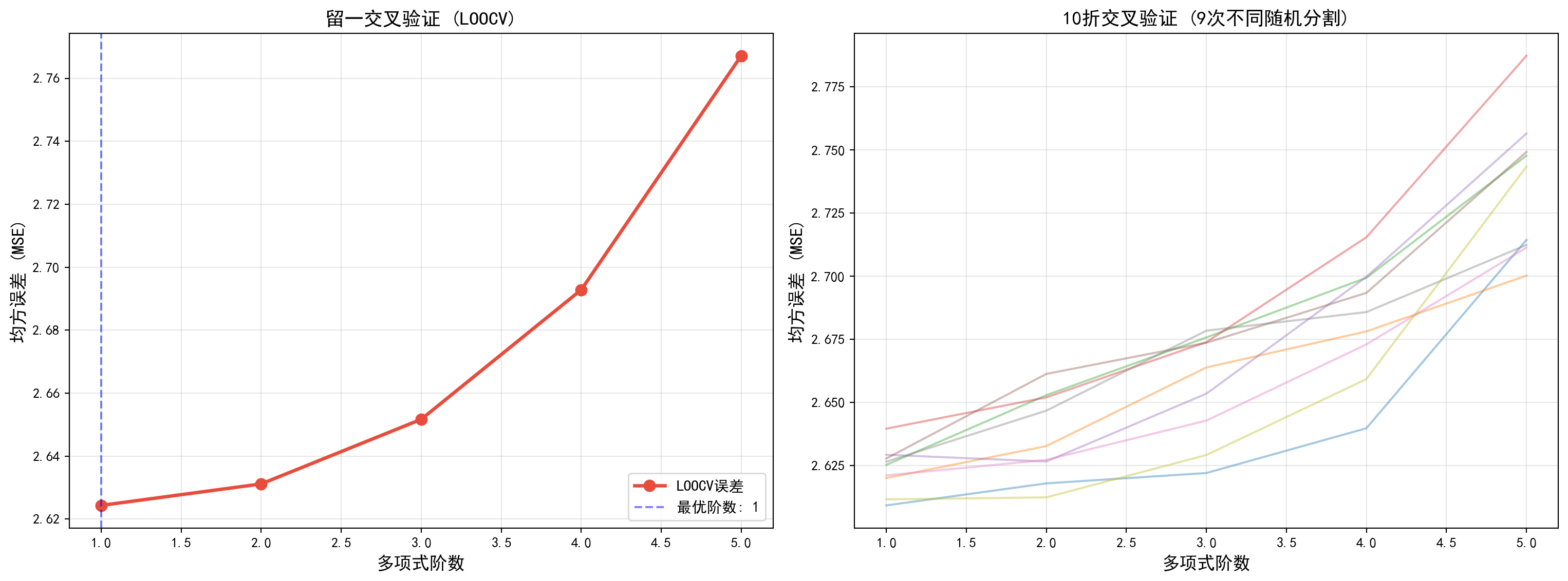 每次训练集大小为 \(n-1\),与全样本训练接近,因此偏差较小;但每次预测误差来自高度重叠的训练集,导致误差项相关,方差可能较大。