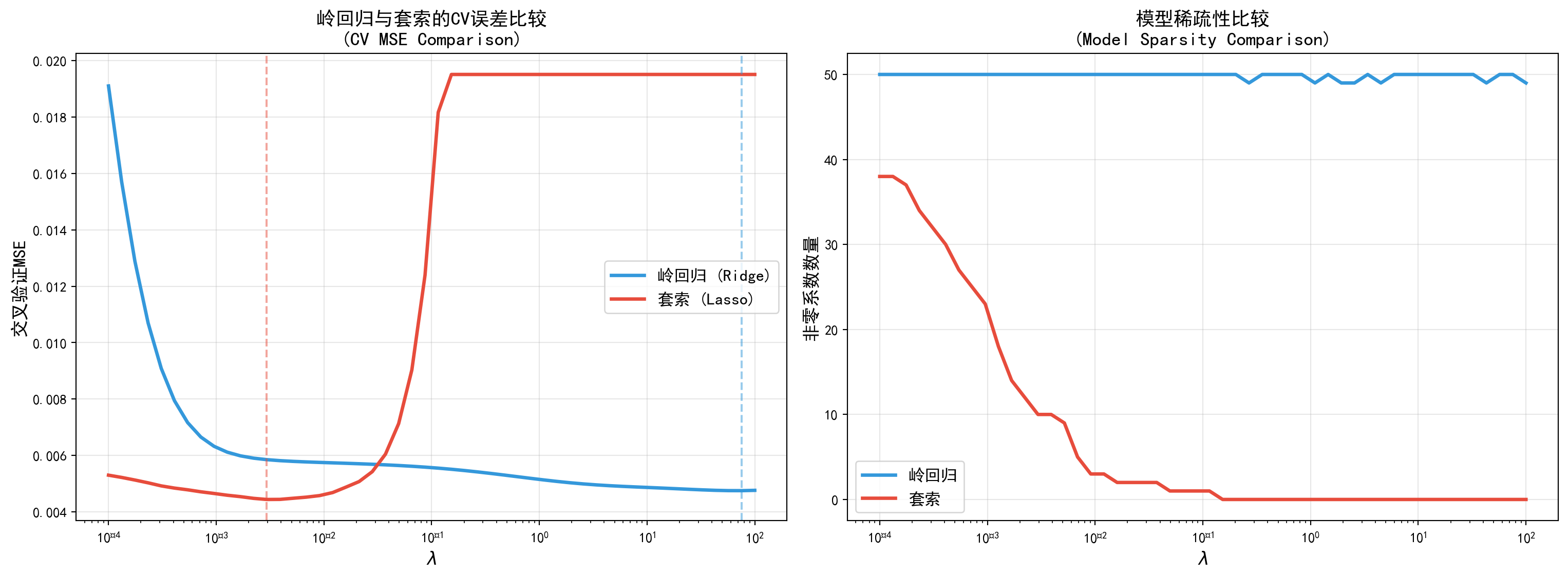 当 \(\lambda\to 0\)(且 \(X^\top X\) 可逆)时,回到 OLS:\((X^\top X)^{-1}X^\top y\);当 \(\lambda\uparrow\) 时,解被更强地向 0 收缩。