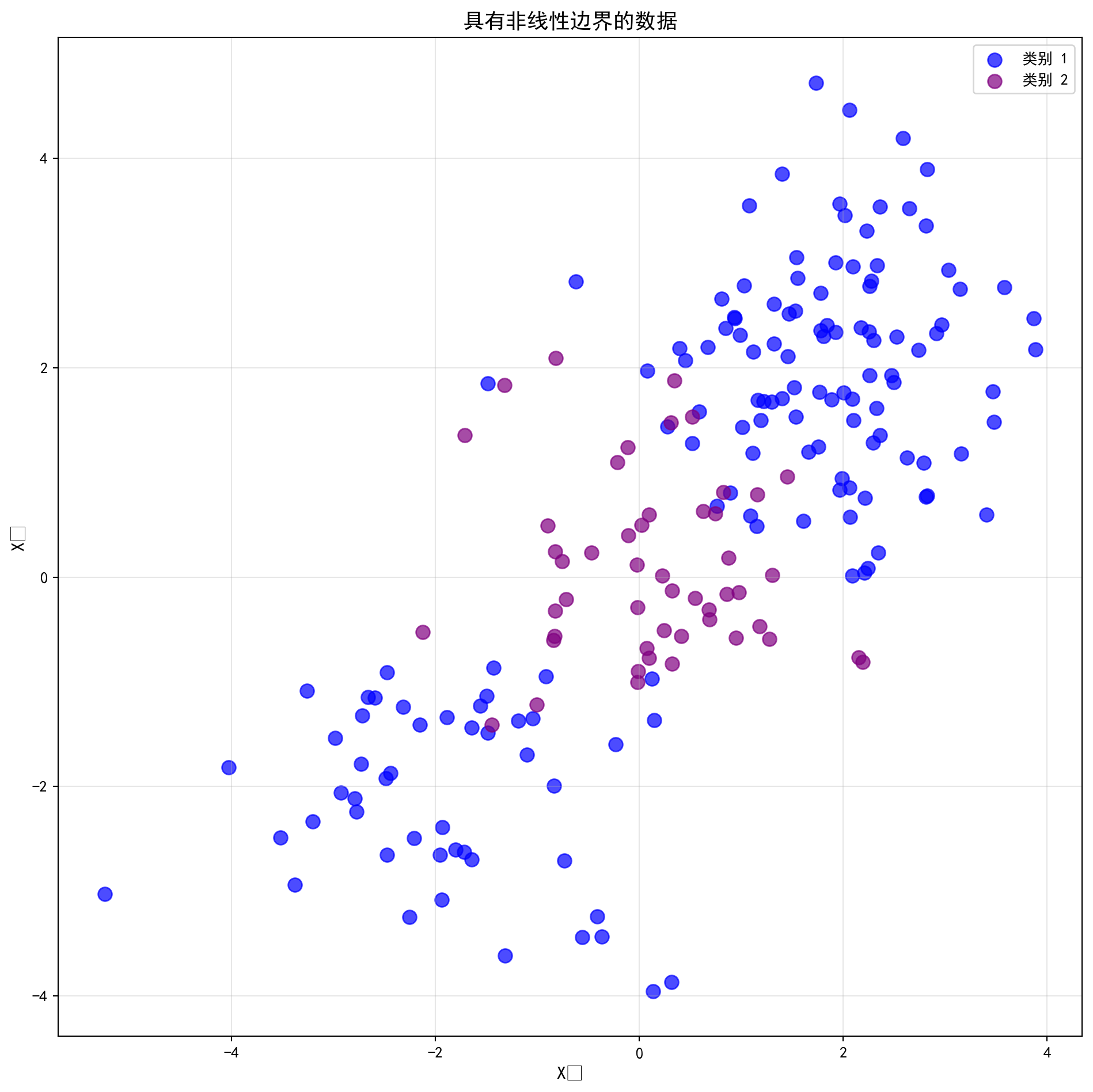 x1_blue, x2_blue = np.meshgrid(np.linspace(- 2 , 2 , 100 ), np.linspace(- 2 , 2 , 100 )) # 生成100×100的二维网格