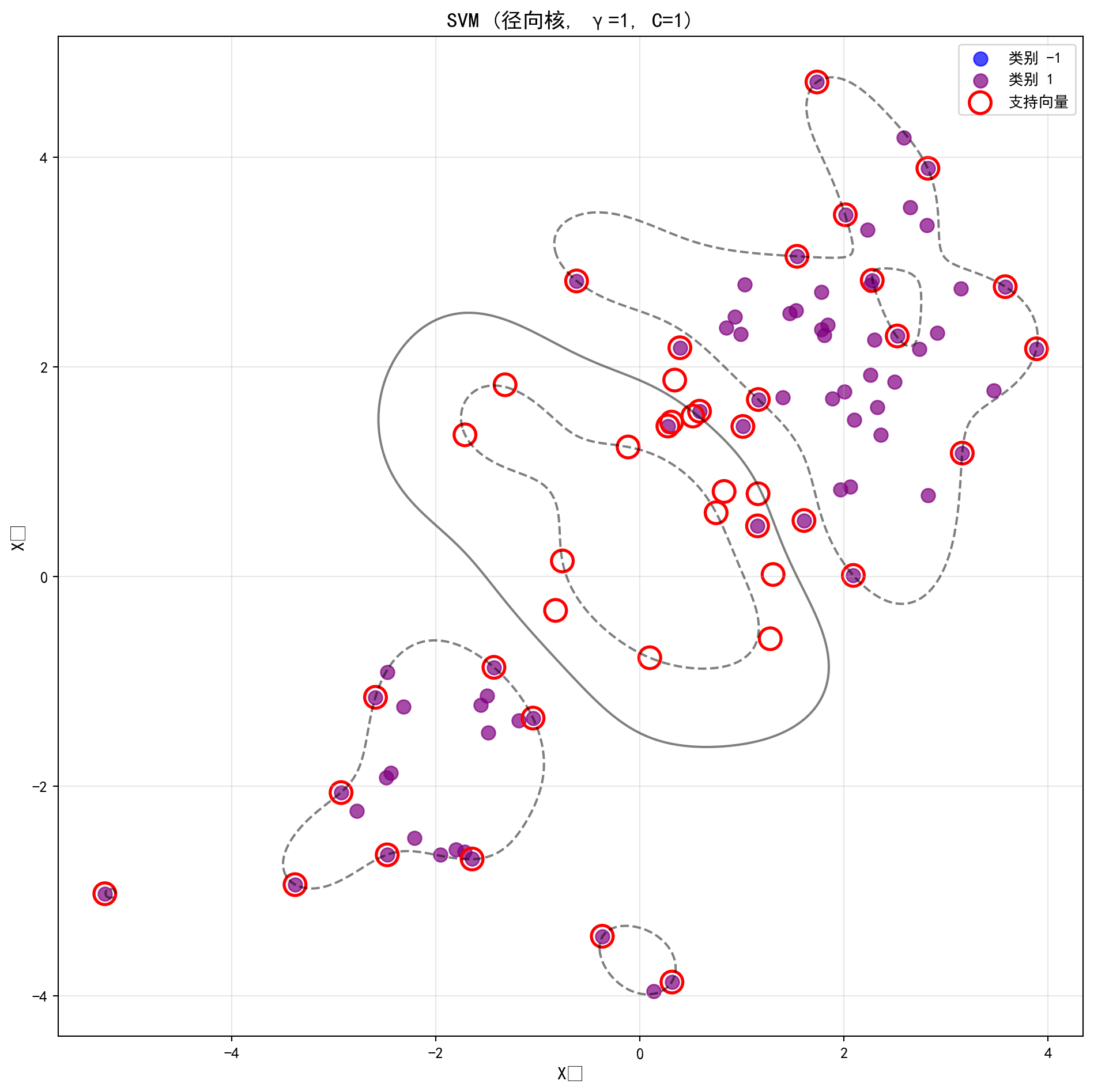 在同一任务上,比较“线性SVM + 手工非线性特征(例如二次项交互项)”与“RBF 核SVM”。讨论: