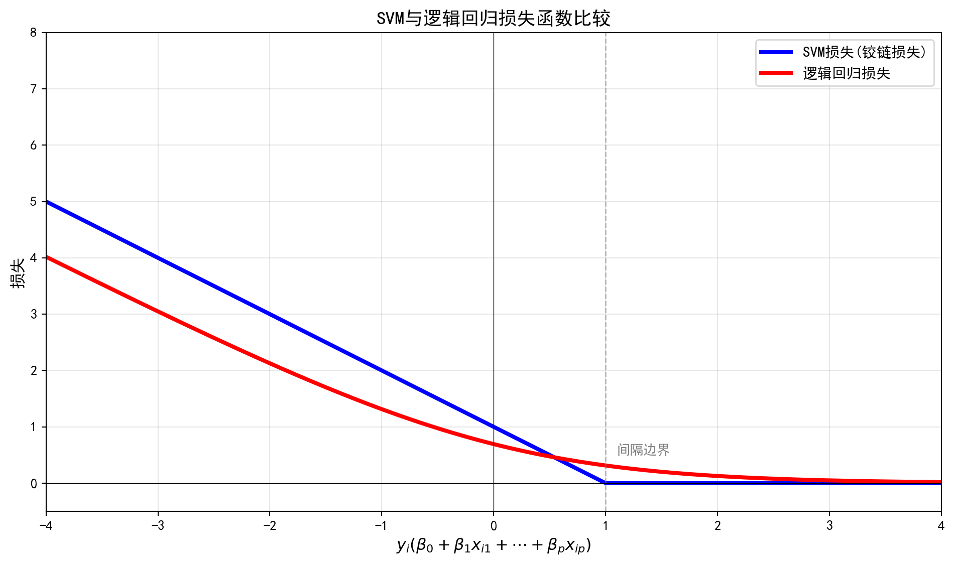 hinge loss 上界 :当 \(yf\le 0\) (错分)时,\(\max(0,1-yf)\ge 1\) ,而0-1 损失为1;当 \(0<yf<1\) (正确但间隔不足)时,-1 损失为0,但 hinge loss 仍为正,起到鼓励更大间隔的作用;当\(yf\ge 1\) 时hinge loss 为0。故 hinge loss 对0-1 损失形成上界,同时更易优化。