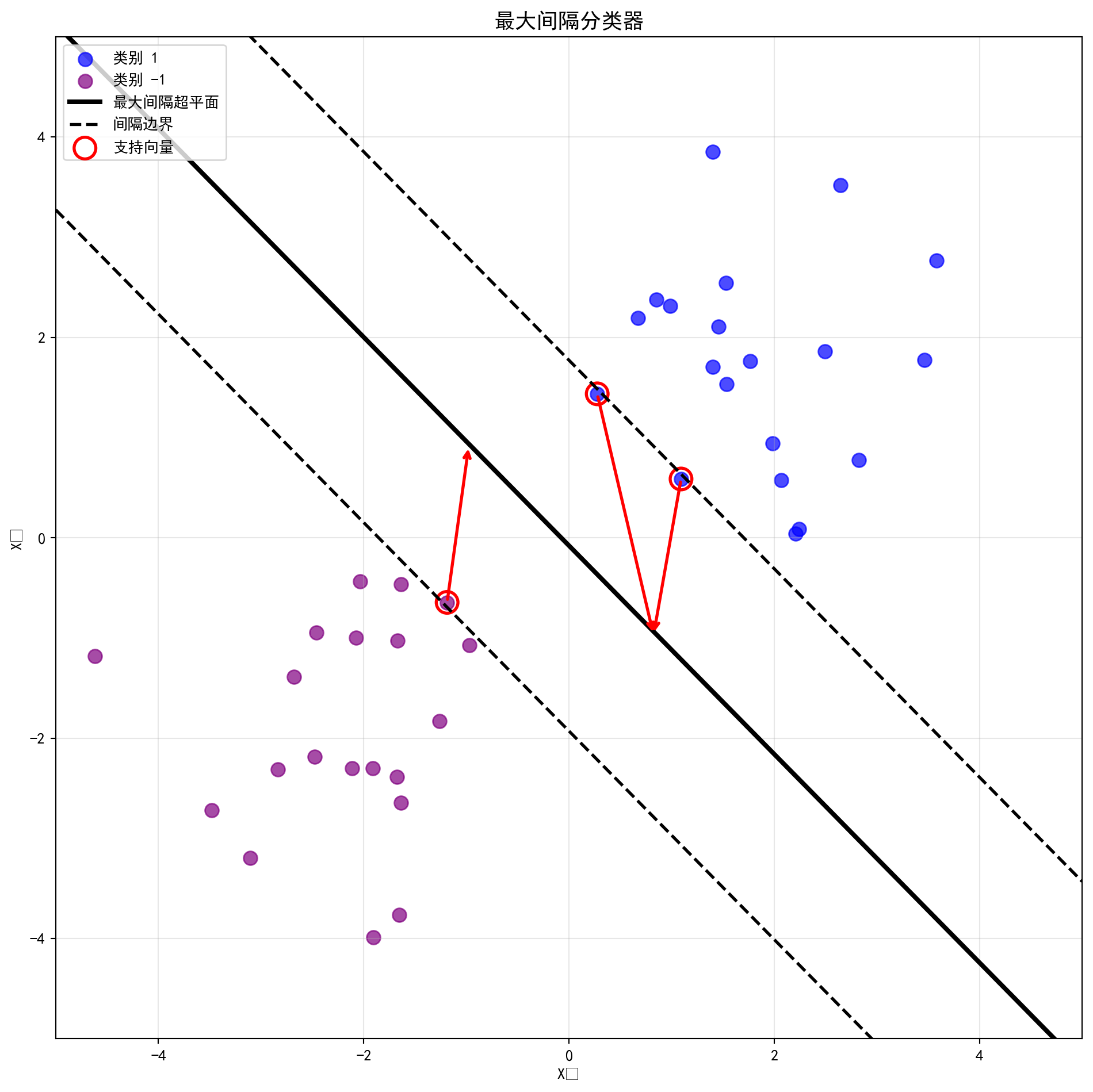 然而,当真正的观测数据散落在特征空间中时(如下图左侧的蓝点和紫点),只要它们是线性可分的,能穿插在它们中间并且不碰到任何一个点的“分离超平面”将会有无数个(图中黑色实线、虚线、点划线只是其中三种可能)。 为了在这无数种可能中找出那条“唯一正确”的分割线,统计学家们制定了一个极其严苛且反直觉的筛选规则:最大间隔原则 。 在下方第二段绘制 图 10.3 的代码中,我们正式召唤出了大名鼎鼎的 sklearn.svm.SVC(kernel='linear')。这台精密的线性切割机不仅找到了一条完美的分割线(中间的黑色实线),还向身体两侧疯狂地推挤着两条透明的防线(间隔边界,黑色虚线)。机器在推挤的过程中,直到它的防线死死地撞上了最近的几个数据点(图中被红色圆圈高亮框出的那三个孤独的观测值)才被迫停止。这三个极其特殊的数据点,就是鼎鼎大名的“支持向量”(Support Vectors) 。 在这个令人震撼的机制中,无论是距离超平面远在天边的其他几百个观测点,还是试图在边缘疯狂试探的噪音,只要它们没有越过雷池进入那两条虚线构成的“间隔带”内部,它们就对最终的模型参数没有任何一丝一毫的决策权。整个宏大的分离超平面,仅仅由这三个被红圈死死锁住的“支持向量”用血肉之躯硬生生撑起。这种“只看最危险边缘,无视安全后方”的极度偏执,造就了最大间隔分类器的简洁。