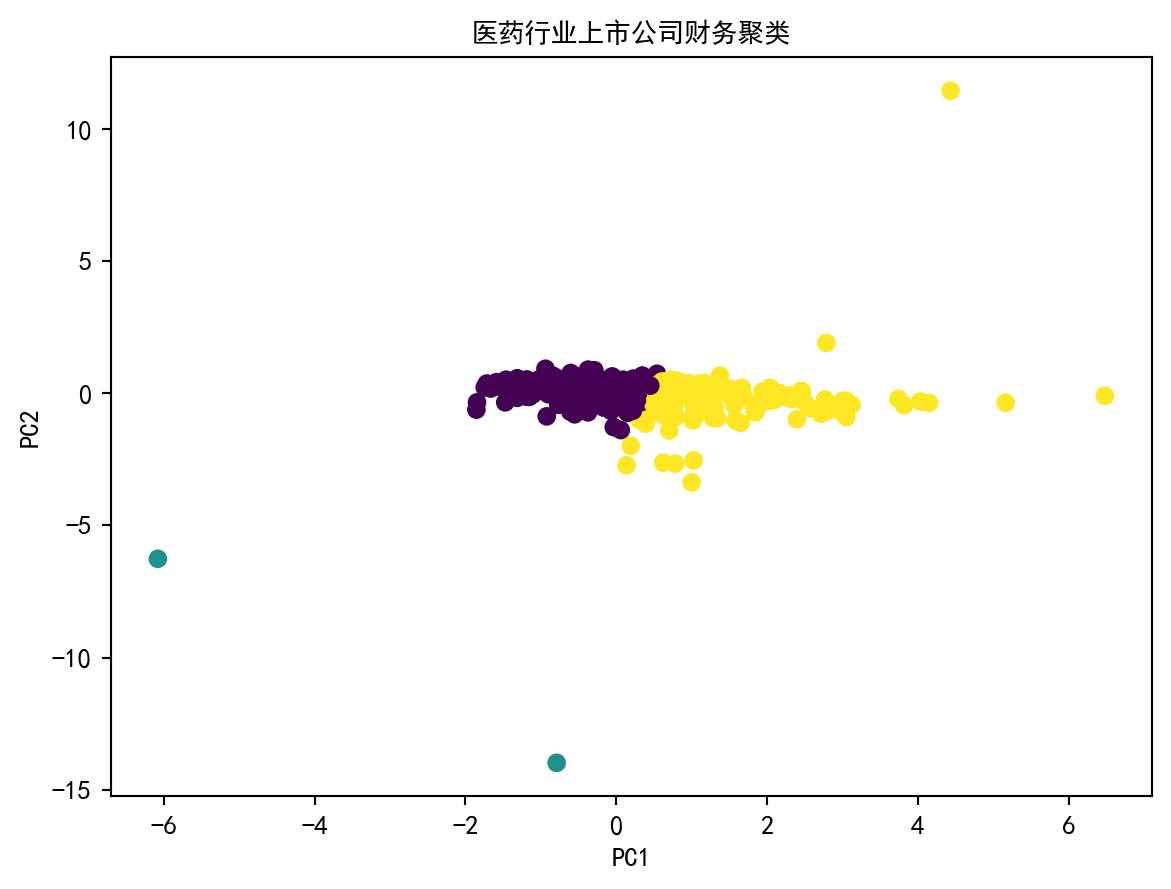 plt.title('医药行业上市公司财务聚类', fontproperties='SimHei') # 图标题