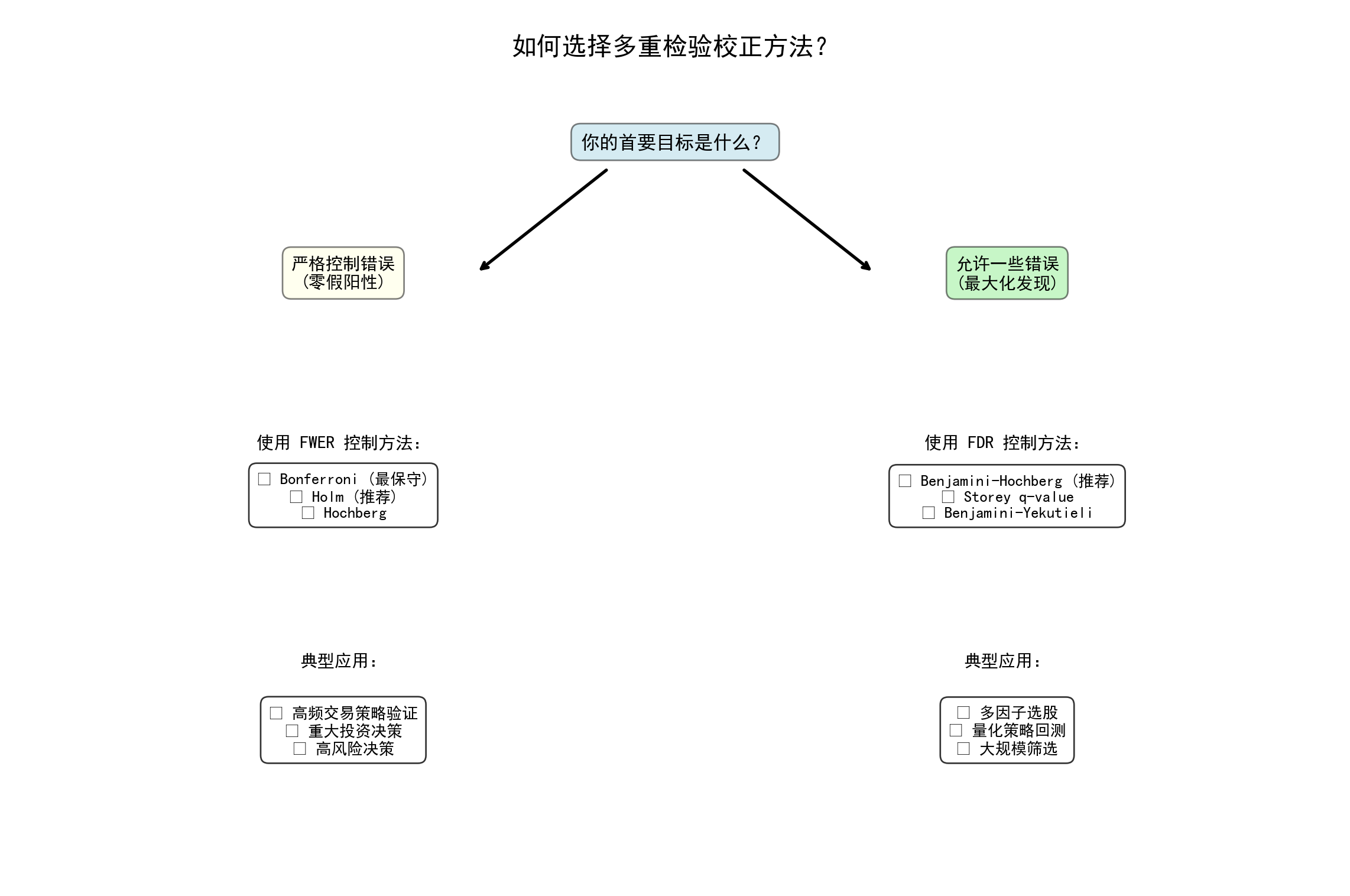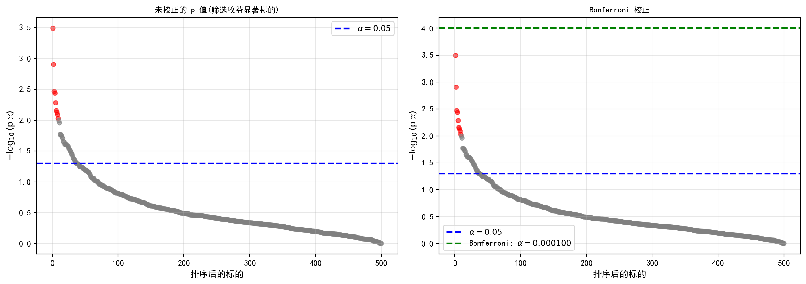 假设你要测试 1000 个量化因子是否能预测股票收益率。如果每个检验使用显著性水平\(\alpha = 0.05\),即使所有因子实际上都没有预测能力,我们仍然期望约\(1000 \times 0.05 = 50\) 个因子被错误地认定为有效。